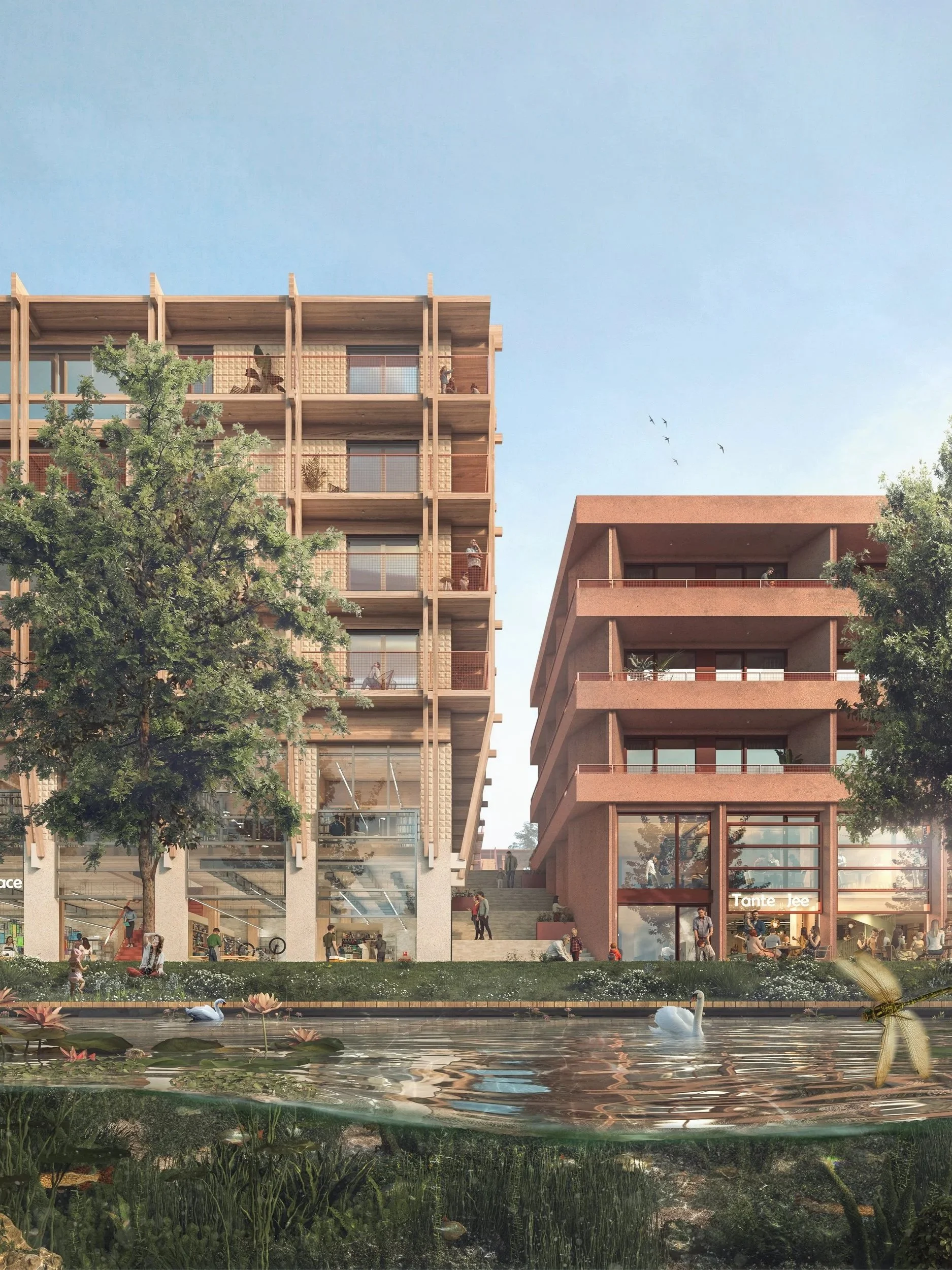 (2) We bouwen alle woningen van hout, middels twee bewezen systemen. Stapelbare houtenmodules voor de appartementen en CLT met flexibel casco en wandensysteem voor de grondgebonden woningen, en. Beiden zijn snel geplaatst, efficiënt in productie, makkelijk aan te passen of uit elkaar te halen, en bovenal comfortabel om in te wonen. Hiermee kunnen we bouwen met hout schaalbaar, technisch haalbaar en betaalbaar maken.