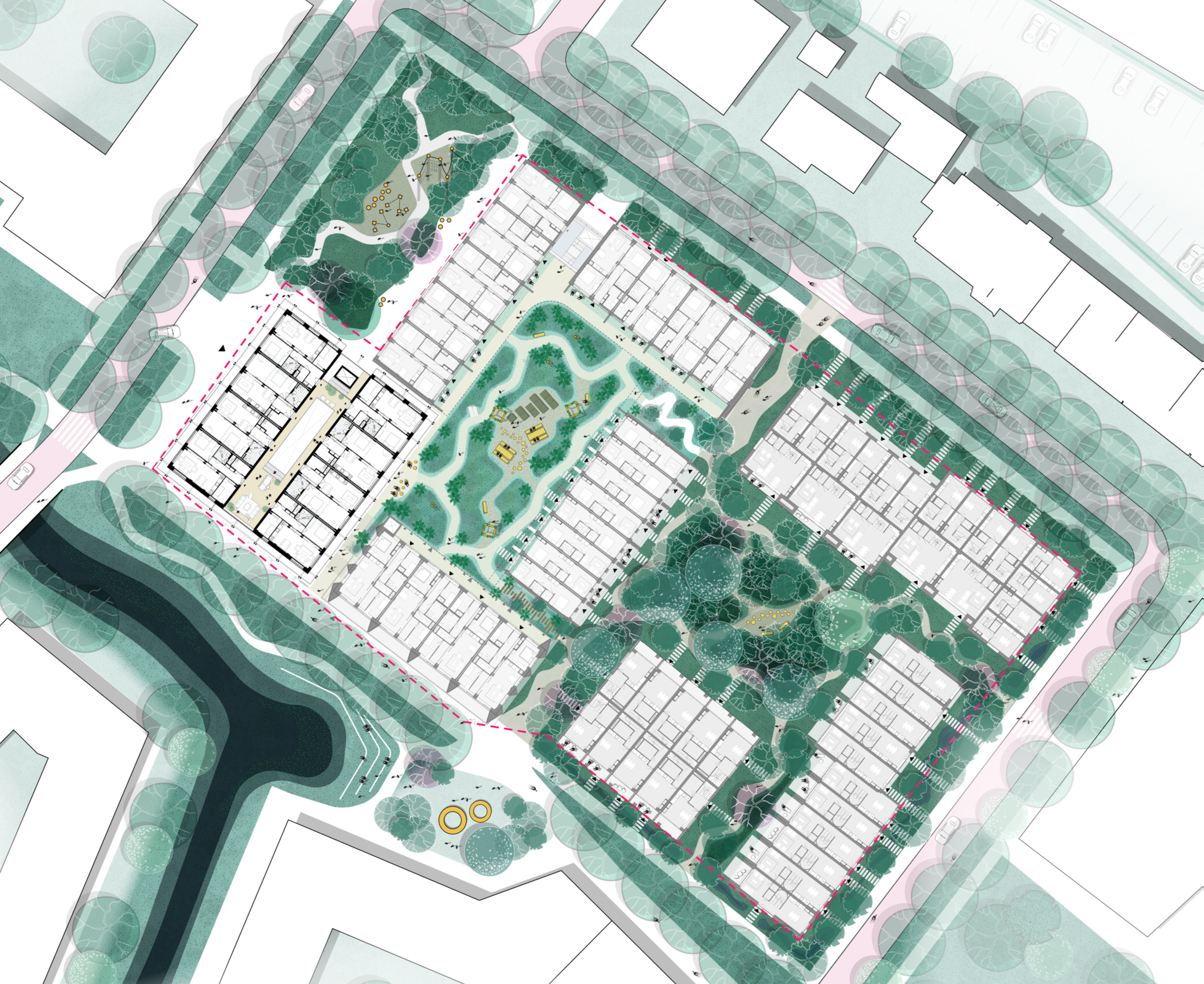 (1) Het bouwblok is open en overzichtelijk, en sluit duidelijk aan op Kamperpoort. Aan de ene kant maken we gestapelde woningen met een gedeelde daktuin, publiek programma aan de straat en een mobiliteitshub. Aan de andere kant staan grondgebonden woningen rond een stadsbos.