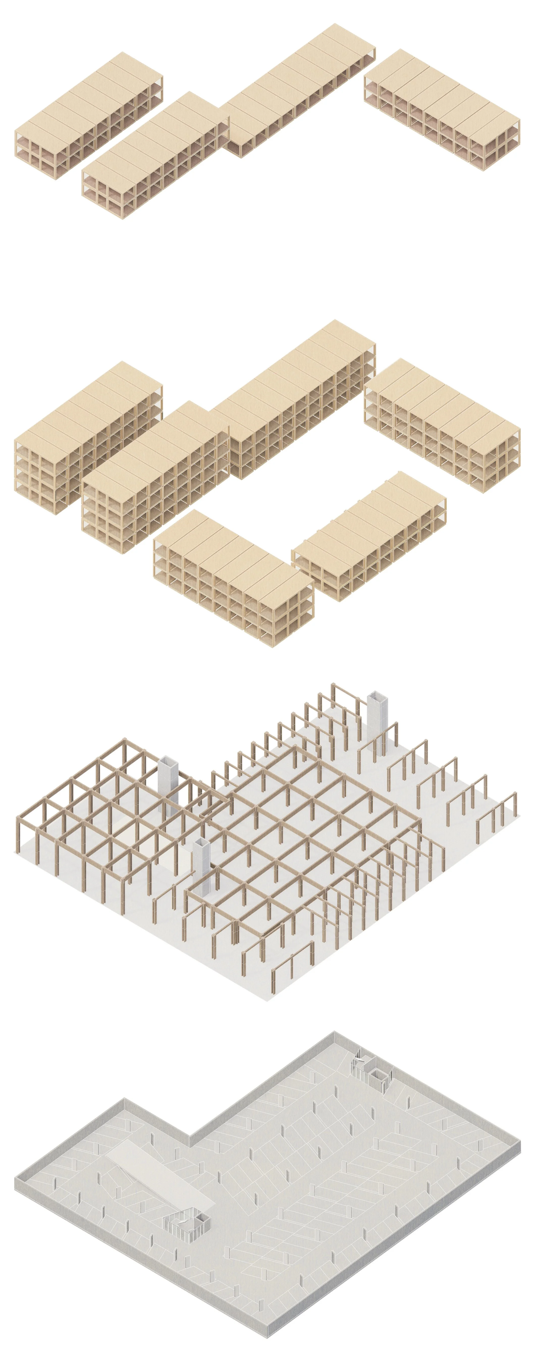 (4) De grote parkeervraag in dit gebied lossen we op met een compacte parkeergarage in de buik van het grote hoekgebouw. Eén laag ondergronds, en twee lagen verstopt achter de publieke plint. Het bovengrondse deel is van hout en kan in een toekomst met minder auto’s toegevoegd worden aan de ruimtes eromheen.