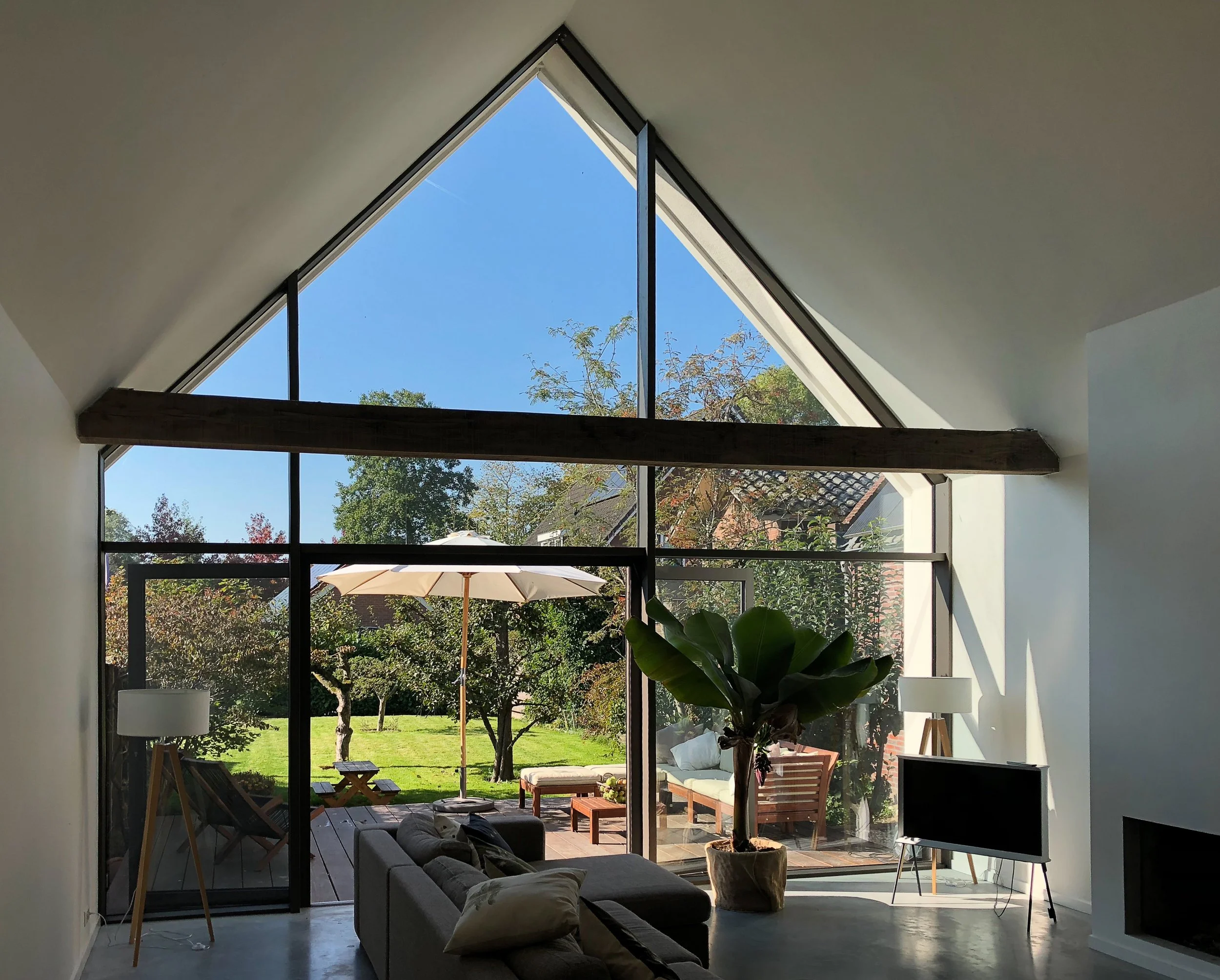 De grote nieuwe leefruimte voelt, ondanks de duidelijke geometrie, toch warm en intiem aan door het schuine dak, maar heeft een veel lichtere en open uitstraling dan het oude boerderijgedeelte van het huis, waar de slaapkamers, badkamers en de werkkamer zijn ondergebracht.